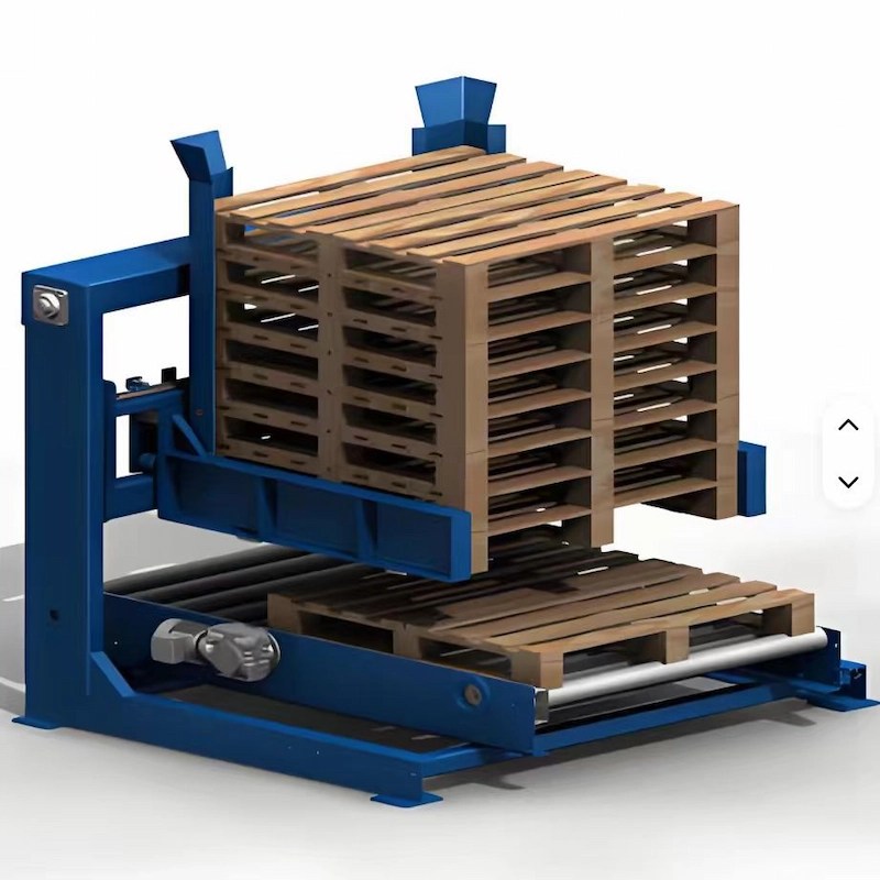 The pallet destacker/stacker operates through a combination of mechanical lifting, positioning sensors, and conveyor systems: